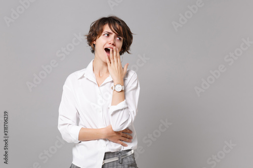 Amazed tired young business woman in white shirt posing isolated on grey background studio portrait. Achievement career wealth business concept. Mock up copy space. Yawning, covering mouth with hand.