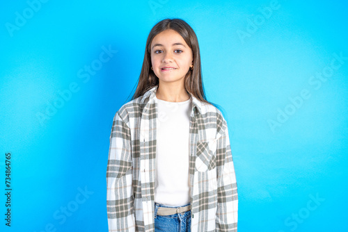 Amazed Young beautiful teen girl wearing check shirt bitting lip and looking tricky to empty space.