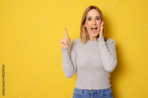 Amazed young woman in casual clothing pointing finger up standing isolated over yellow background.