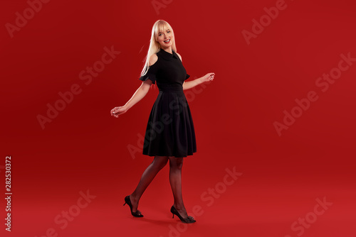 Amazing luxury seductive woman in stylish black party dress posing on red background. Bright smokey eyes make up, healthy blond hairs. Fashion portrait. Celebrating birthday party.