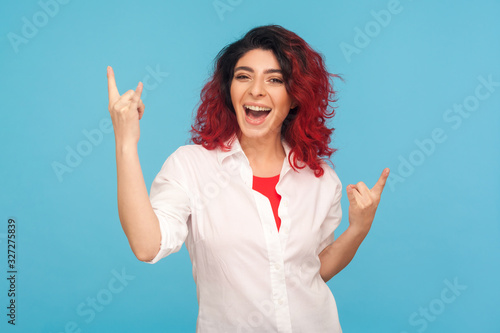 Amazing vivid hipster woman with fancy red hair in white shirt feeling happy crazy, showing rock n roll sign, devil horns gesture and smiling excitedly. indoor studio shot isolated on blue background