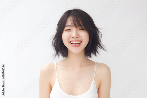 An adorable Asian girl, donning a bright smile, is elegantly photographed in her underwear against a pristine white backdrop. generative AI.