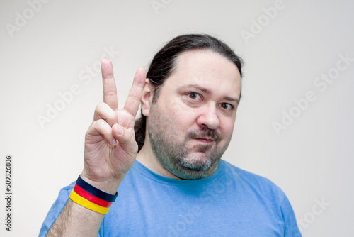 An adult, unshaven man in a T-shirt shows a sign of victory with his fingers. Bracelet in the colors of the German flag.