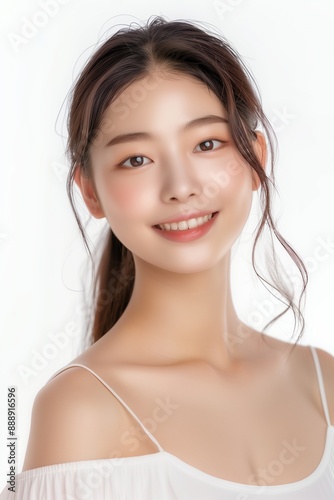 An asian beauty model smile pose in front of a white background
