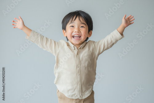 An Asian boy in a light beige shirt, jumping high with an expression of pure happiness