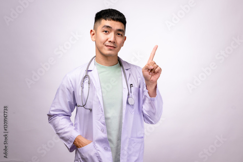 An Asian male doctor wearing a white lab coat and stethoscope raises his index finger, giving a gesture of advice or instruction. He has a confident expression. The background is white