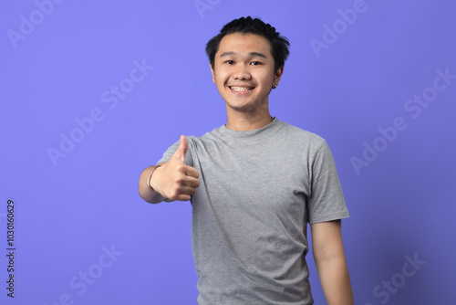 An Asian man giving a thumbs-up with a friendly smile, standing in front of a purple background. He is wearing a gray t-shirt with a circular graphic on the chest, exuding positivity and confidence