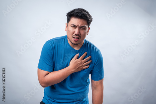 An Asian man in a blue t-shirt against a white isolated background is clutching his chest with both hands, expressing intense pain or discomfort. His facial expression suggests distress