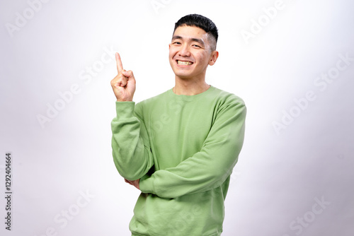 An Asian man in a green sweatshirt is smiling excitedly while raising one finger as if making a point or sharing an idea. He stands confidently against a plain white background
