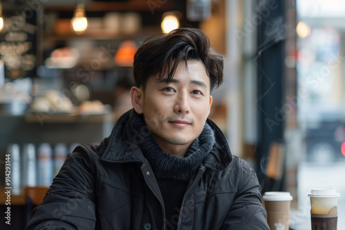 An Asian man with a stylish haircut, relaxing at a chic coffee shop