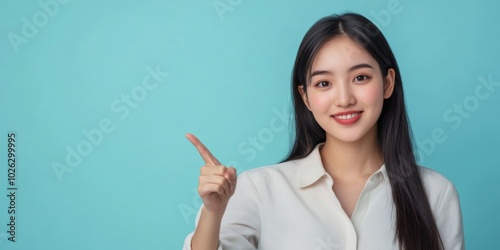 An Asian model with an air of elegance, pointing towards a copy space light blue background, showcasing her beauty