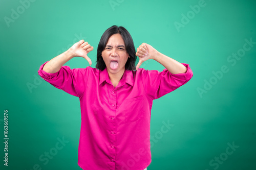 An Asian woman in a bright pink shirt poses against a green background, making a playful face by sticking out her tongue and giving a thumbs-down gesture. Her expression is humorous