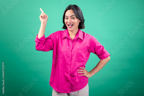 An Asian woman in a bright pink shirt stands against a green background, smiling and pointing upwards with one hand, exuding a cheerful and confident expression in a studio setting