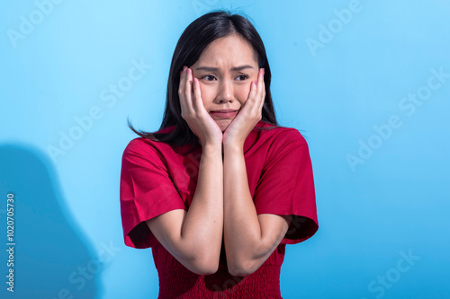 An Asian woman in a red dress is standing against a light blue background. She has a worried or concerned expression, pressing her hands to her cheeks, emphasizing the emotional reaction