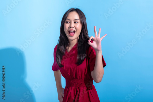 An Asian woman in a red dress smiling while making an "OK" hand gesture with her right hand. She looks excited and cheerful, with a light blue background.