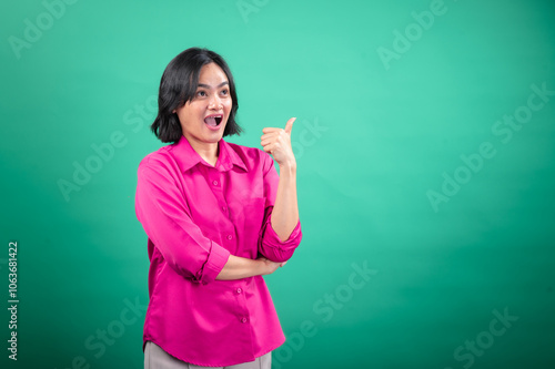 An Asian woman in a vibrant pink shirt stands against a green background, smiling and giving a thumbs-up gesture. Her cheerful expression and confident pose convey positivity and approval.