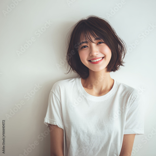 An Asian woman models a plain white t-shirt against a clean white background, providing a clear base for design mockups.