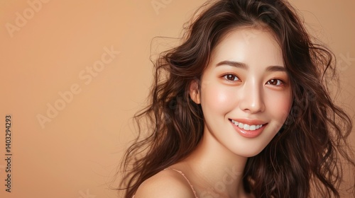 An Asian woman natural makeup with long hair is smiling and has her hand on her face.