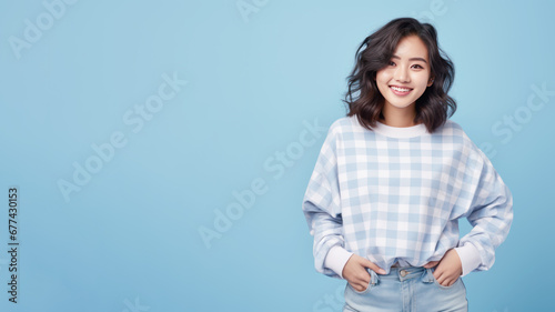 An Asian woman wearing gingham pattern sweatshirt isolated on pastel