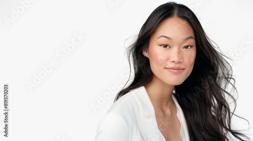 An Asian woman with long hair, wearing white and smiling at the camera. She is posing for an advertising campaign against a plain background