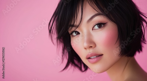 An Asian woman with short hair and a radiant smile stands gracefully against a pink background. This image embodies natural beauty, skincare, and the calming essence of spa therapy.