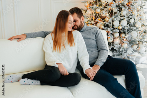 An attractive couple near Christmas tree and hugging. New Years atmosphere. Tender hugs near the Christmas tree of two people
