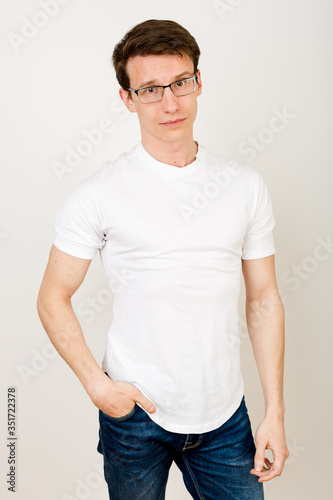 An attractive guy in casual clothes stands on a white background with his hand in his pocket and looks into the camera, lightly thoughtfully, yet calmly.