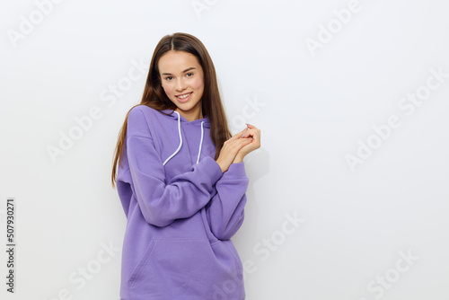an attractive woman is standing on a white background in a purple tracksuit smiling happily and holding her hands joined together