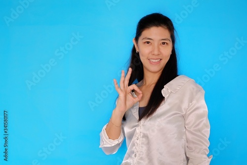 An attractive young Asian woman making an okay sign with her right hand to confirm that everything is alright. With light blue plain background.