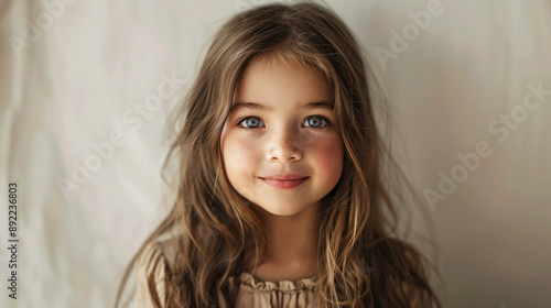 An authentic portrait of a small girl with long brown hair, genuinely smiling.