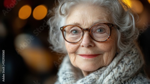 An elderly woman captured in a moment of serene contemplation, wearing glasses and a cozy knitted scarf, encapsulates wisdom and warmth in her gentle smile