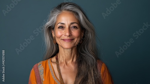 An elderly woman radiating wisdom and grace while smiling gently, dressed in vibrant traditional attire, epitomizing beauty and charm at any age.