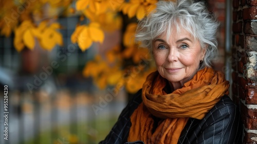 An elderly woman with short, gray hair and a warm, friendly smile stands against a brick wall with a backdrop of vibrant autumn foliage