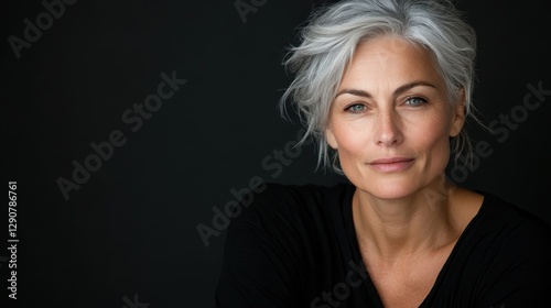 An elegant portrait of a mature woman with beautiful silver hair and a confident expression, highlighted by a dark backdrop, capturing the essence of timeless beauty.