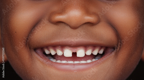 An extreme close-up of a child's joyful smile with a missing front tooth