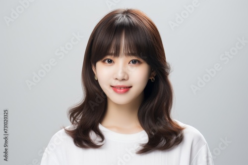 an exuberant and delightful Asian woman wears a white t-shirt, radiating joy as she showcases her smile on a blank white background. Generative AI.