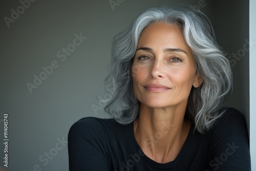 An image of a gray-haired woman posed calmly, with a serene expression, taken in natural lighting. Her gentle smile and relaxed demeanor illustrate a peaceful aging process.