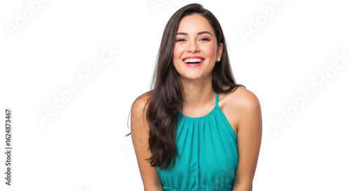 An image of beautiful woman smiling with joy.. The scene includes face, fashion, hair, white, elegant, style, beauty, looking, smile,