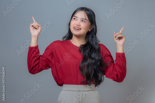 An Indonesian Asian woman in a red long-sleeve shirt and beige pants smiling and pointing upwards with both hands. She is posed confidently, with a joyful expression against a neutral gray background.