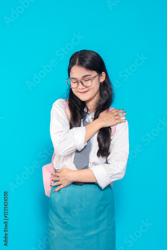 An Indonesian high school student in a school uniform, smiling gently while hugging herself in a comforting pose. She wears glasses and a backpack, standing against a bright blue background.