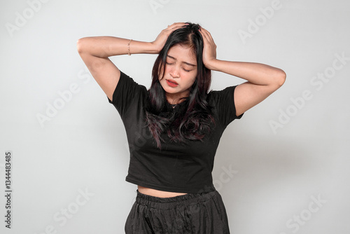 An Indonesian woman with long black hair wearing a black outfit, holding her stomach with a pained expression. She appears to be experiencing discomfort or stomach pain.