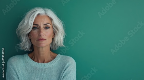 An older woman with grey hair stands gracefully against a vibrant teal backdrop, showcasing elegance and tranquility while wearing a light turquoise sweater.