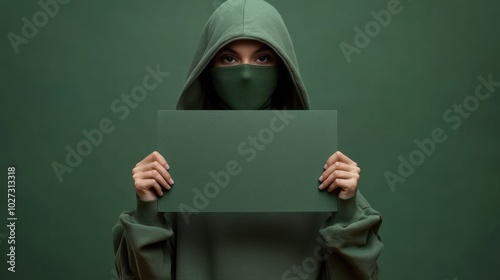 An person with covered face in green hooded sweatshirt, holding a blank green sign, on plain green background, solid hues