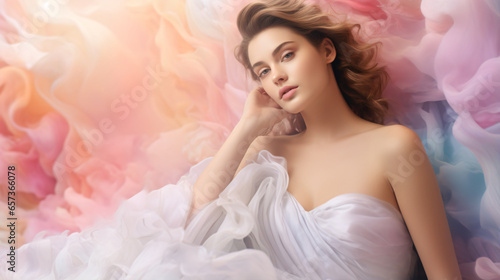 an ultra-realistic model adorned in a pastel-colored wedding gown, with flawless pastel-shaded makeup, set against a backdrop of billowing pastel cotton - Generative AI