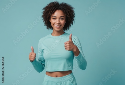 An upbeat woman with curly hair in active wear gives two thumbs up, her teal crop top matching the joyful mood.