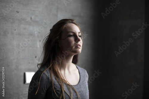 Angled View of Female Model Behind Grey Concrete Wall