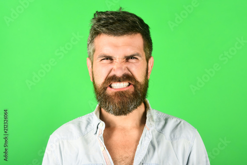 Angry bearded man. Anger. Aggressive bearded man. Man with long beard and mustache. Feeling and emotions. Close Up. Emotions. Feelings. Facial expressions concept. Green background.