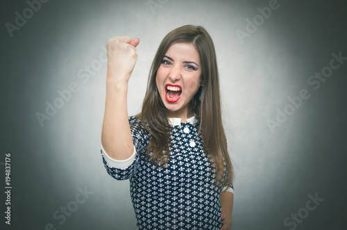 Angry irritated woman is shouting isolated on gray background. Debates. Quarrel. Demanding dissatisfied boss.