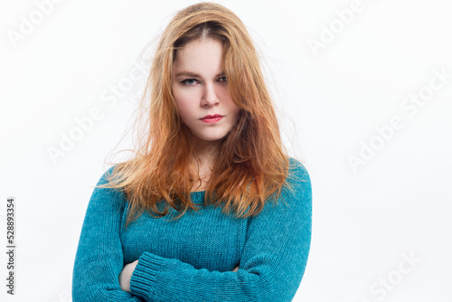 Angry red-haired shaggy young girl in a turquoise sweater with her arms crossed. Aggression and negativity. White background. Close-up.