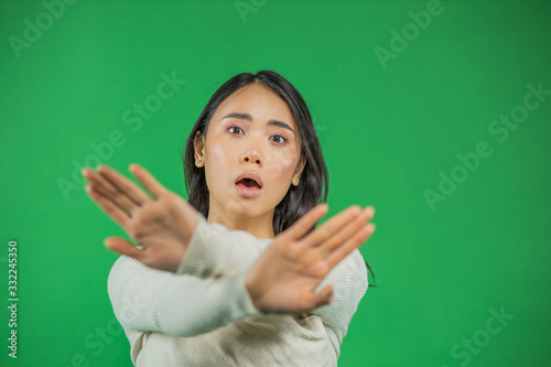 Angry serious asian woman showing gesture with crossed arms and looking at camera while standing isolated over green background